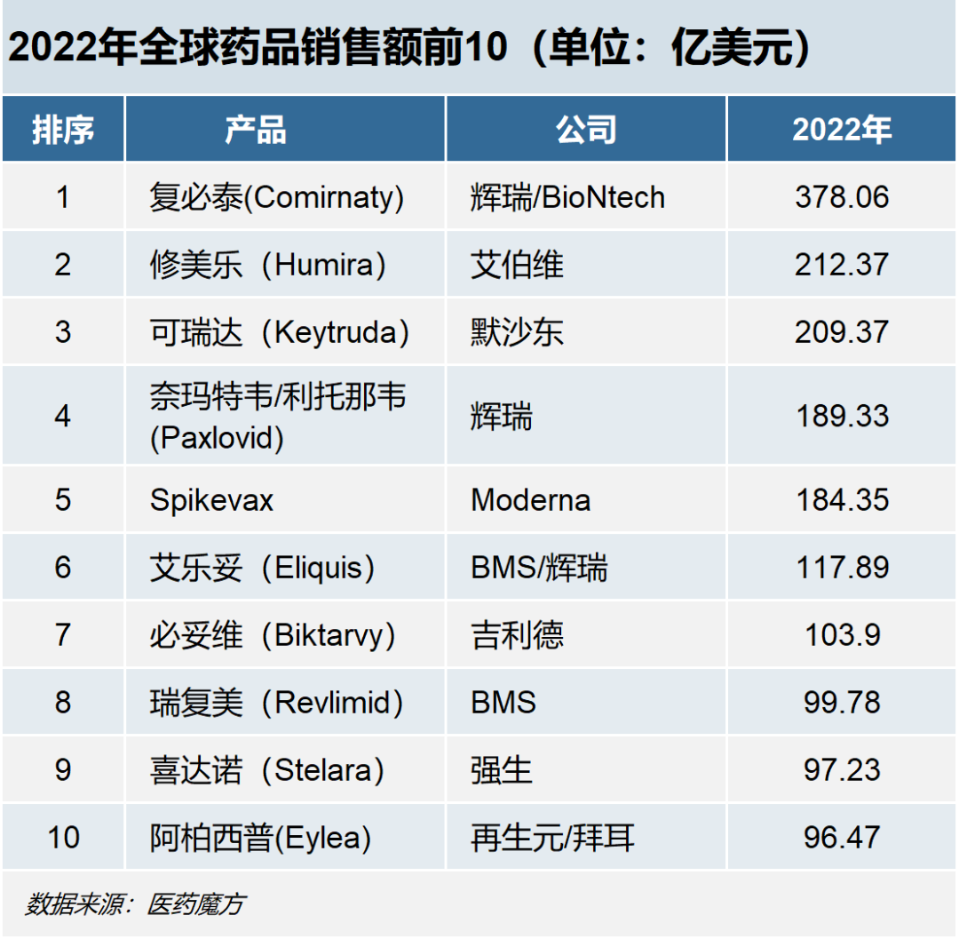 去年,新冠相关产品异军突起,辉瑞/BioNTech的新冠疫苗复必泰(Comirnaty)、Moderna的新冠疫苗Spikevax和辉瑞的新冠抗病毒药奈玛特韦/利托那韦(Paxlovid)三款产品跃入全球创新药前10畅销榜单,复必泰全年销售额更是创纪录达到378多亿美元。
