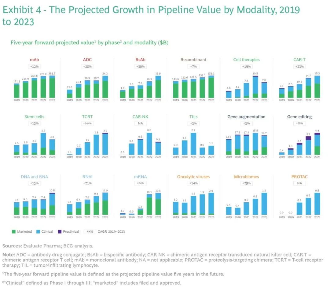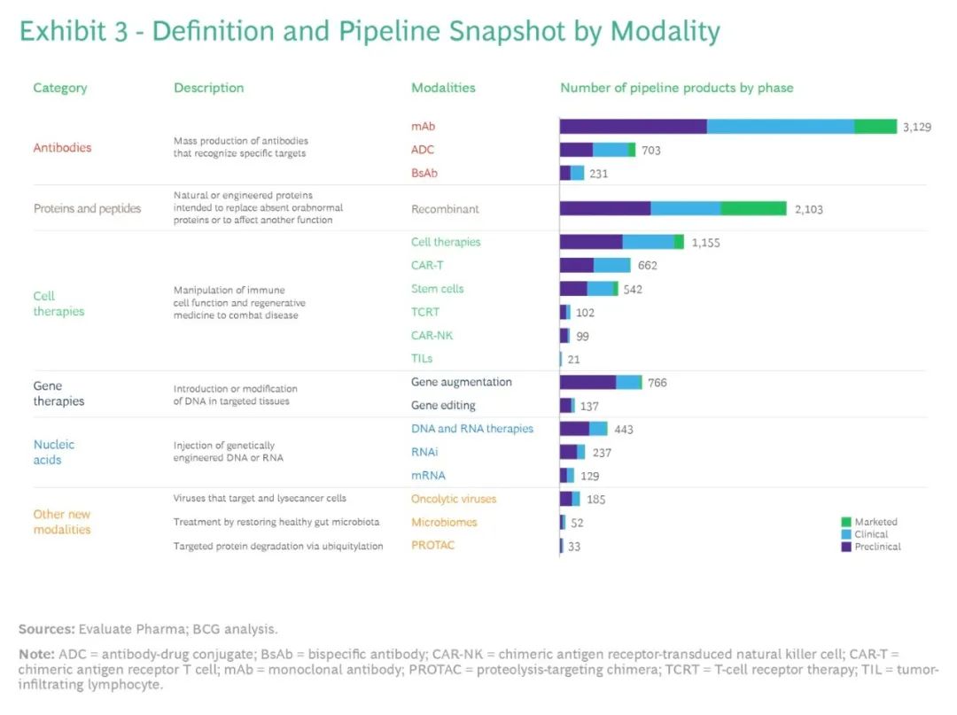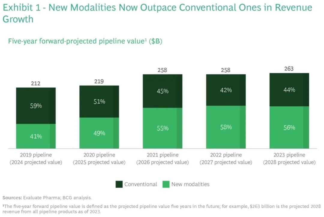 据BCG报告,5年后,以抗体为代表的创新疗法(New Drug Modalities)将成为制药产业价值增长的主力,小分子药物等传统药物的竞争力逐渐降低。届时,全球前6大畅销的药品将全部来自创新疗法。