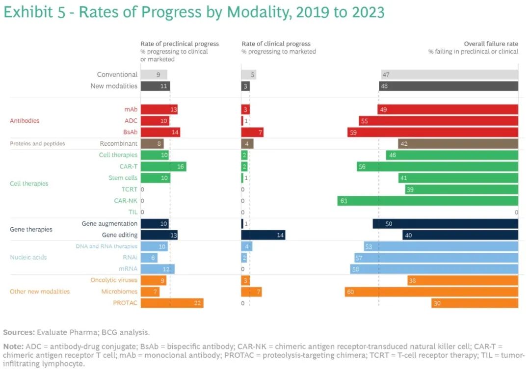 BCG报告指出,早期开发阶段创新疗法的开发进度,整体上略快于传统疗法,但最终成功上市的创新疗法所占比例较小。在这些创新疗法中,单抗、双抗和CAR-T细胞疗法的开发进度高于平均水平,特别是在临床前阶段。