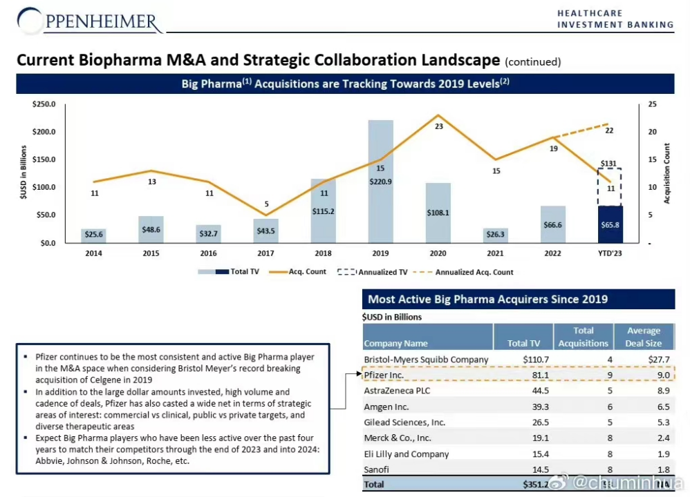 紧跟在他身后的还有默沙东、礼来和赛诺菲,他们正在密集地补充管线。该机构预计,过去四年中不太活跃的跨国药企艾伯维、强生、罗氏将在2023年底和2024年参与到并购的队伍中来。