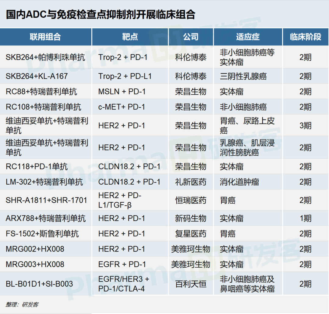 与PD-1/PD-L1联合用药的研发思路相似,ADC也从单药治疗拓展到了联合治疗。国内已有恒瑞医药、科伦博泰、荣昌生物等多家企业开始了ADC联合疗法研究,其中ADC+免疫检查点抑制剂成为热门尝试组合。
