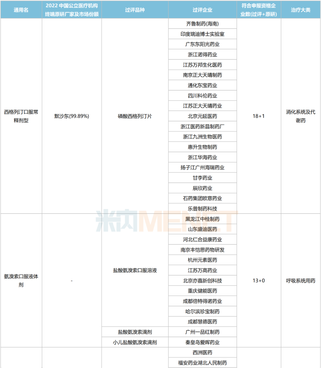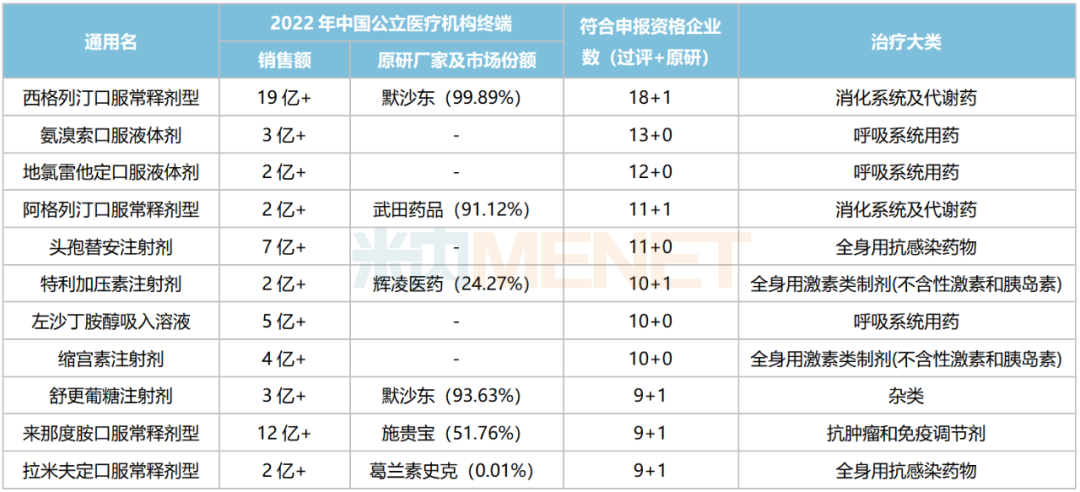 西格列汀口服常释剂型、来那度胺口服常释剂型2022年在中国公立医疗机构终端的销售额均超过10亿元,且均由原研厂家主导市场,其中西格列汀口服常释剂型符合申报资格企业数接近20家,竞争激烈。