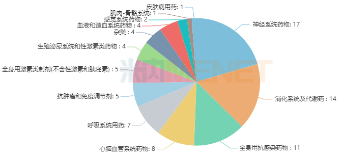 从治疗领域看,83个品种涵盖13个治疗大类,集中在神经系统药物、消化系统及代谢药、全身用抗感染药物,涉及的品种数分别达17、14、11个。在过往的化药集采中,这三大类药物亦是重点,目前累计集采品种数分别超过40个、40个、60个。