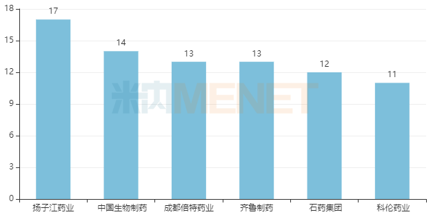 扬子江药业以17个品种领跑,目前公司已有45个品种在化药集采中顺利中选,为国采的头部供应商之一;中国生物制药以14个品种接近其后,凭借着正大天晴药业、南京正大天晴、正大丰海等多家子公司,中国生物制药在历次化药集采中已累计47个品种中选。
