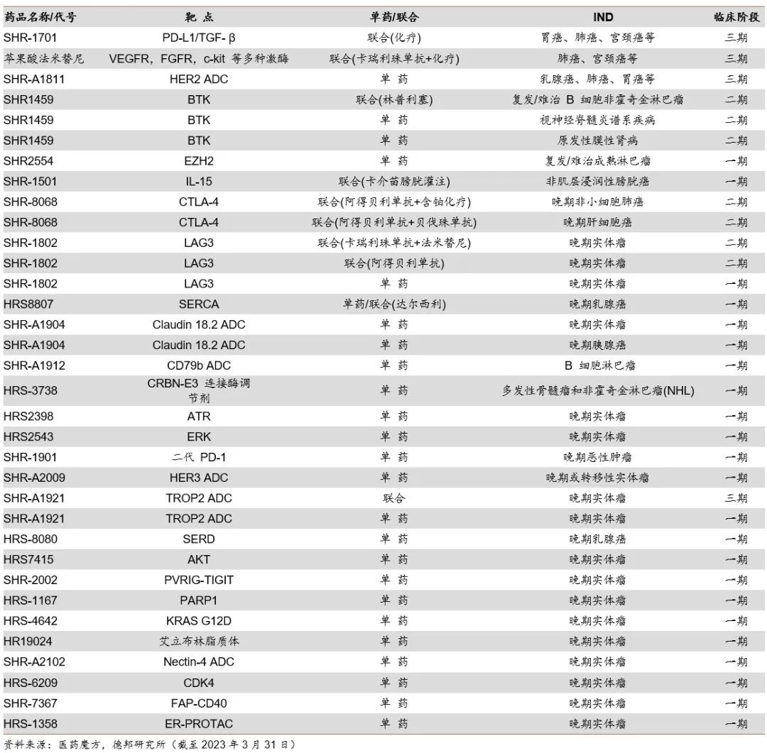 在肿瘤管线方面,法米替尼(多靶点酪氨酸激酶抑制剂)、SHR-1701(PD-L1&TGF-β 双抗)、SHR-A1811(HER2 ADC)等已处于三期阶段。早期管线中,覆盖LAG3、MEK、EZH2、TIM3、TIGIT等核心靶点,同时众多创新分子并未公布靶点。