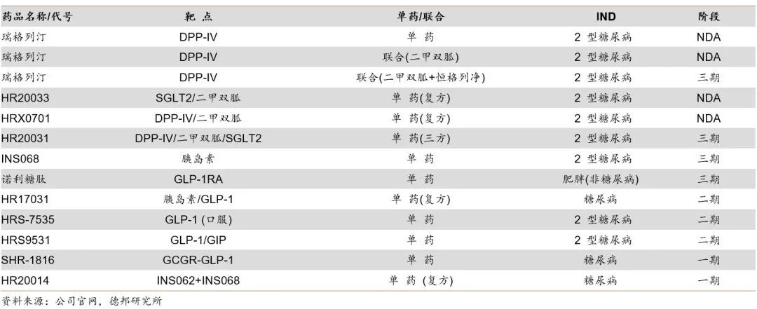 在传统优势肿瘤领域以外,恒瑞医药在自免及代谢等领域将逐渐进入收获期。在代谢管线方面,瑞格列汀(DPP-IV抑制剂)和不同靶点的复方制剂(HR20033、HRX0701)已处于NDA阶段,胰岛素和诺利糖肽(GLP-1)等已处于三期阶段。早期管线中,覆盖GLP-1、GCGR等核心靶点。