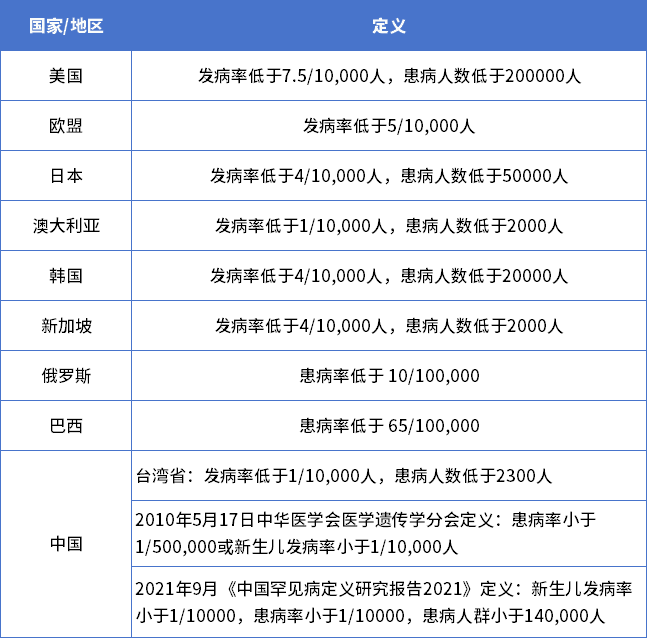 罕见病,即非常少见的疾病,全球估计有7000余种。各国的疾病种类不尽相同,对罕见病的界定标准也存在差异(如表1)。