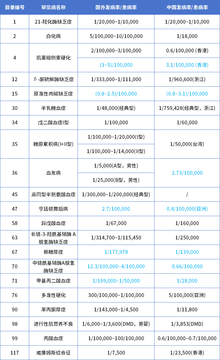 注:黑色为发病率;蓝色为患病率资料来源:《罕见病诊疗指南(2019年版)》;药智咨询整理