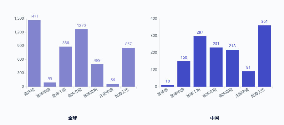 截止2023年6月底,全球共有5159个罕见病药物在研,1471个尚处于临床前,国内在研药物有1369个(如下图所示)。