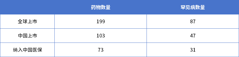 截至目前,基于《第一批罕见病目录》,199种药物在全球上市,涉及87种罕见病;其中103种药物在中国上市,涉及47种罕见病;73种药物在中国上市并纳入医保,涉及31种罕见病。