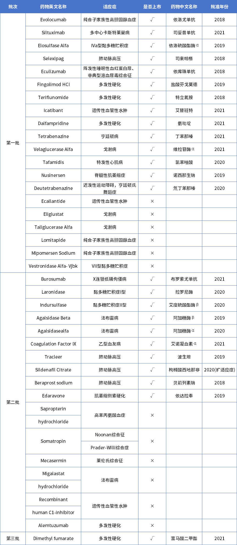 表7 三批临床急需境外新药名单目录内的罕见病药物