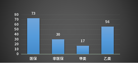 截至目前,已有31种罕见病的73种药物纳入医保,其中医保甲类药物17种,乙类药物56种(图2)。