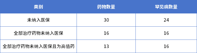 24种罕见病的30种药物未纳入医保,其中16种罕见病的全部治疗药物(共计16种)均未纳入医保,13种药物属于高值药(见表8、9),年治疗费用多为几十万元到上百万,远远超过家庭灾难性卫生支出的上限。