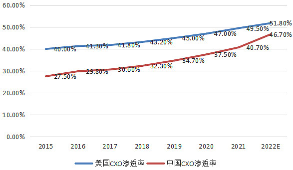 中美两国CXO渗透率都是逐年提升的,主要原因是药企在越来越高的研发成本下,想通过外包一部分研发来降本增效。