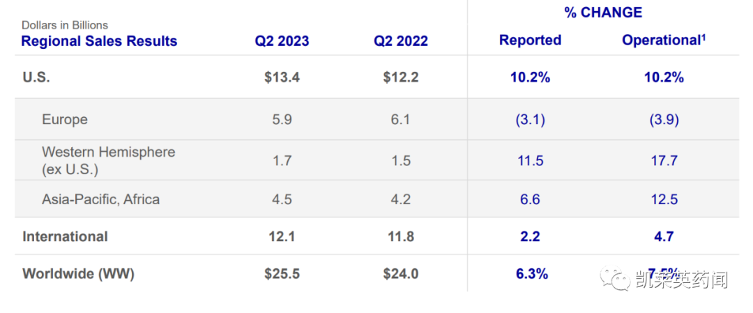 7月20日,强生发布2023H1业绩,总营收502.76亿美元,同比增长6%,其中Q2营收255.30亿美元,同比增长6.3%。研发投入73.92亿美元,同比增长3.2%。其中制药业务上半年收入271.44亿美元(+3.7%),Q2收入137.31亿美元(+3.1%);医疗器械业务收入152.69亿美元(+10.1%),Q2收入77.88亿美元(+12.9%);消费者保健业务收入78.63亿美元(+6.4%),Q2收入40.11亿美元(+5.4%)。