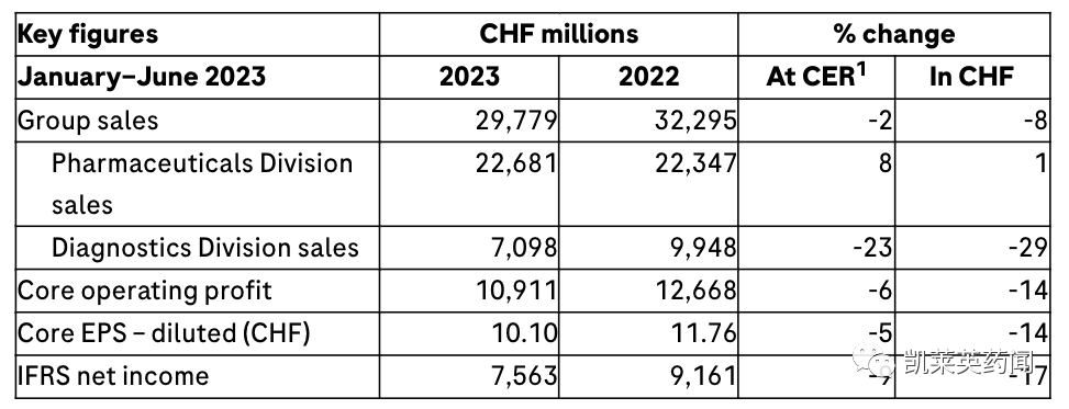 7月27日,罗氏公布 2023 上半年业绩,营收 297.79 亿瑞士法郎,同比下降 2%(按 CER 计算);净利润为 75.63 亿瑞士法郎,同比下降 9%;研发投入 64.49 亿瑞士法郎,同比增加 8%。其中,诊断部门收入 70.98 亿瑞士法郎,由于 COVID-19 疫情检测需求的降低,营收同比下降23%。其中,中国区制药业务收入为 15.05 亿瑞士法郎(+3%),主要驱动因素包括抗流感药达菲、乳腺癌药物帕捷特(帕妥珠单抗)、流感药物速福达(玛巴洛沙韦)、新冠肺炎和关节炎药物雅美罗(托珠单抗),以及用于淋巴瘤的抗体偶联药物(ADC)优罗华(维泊妥珠单抗)。