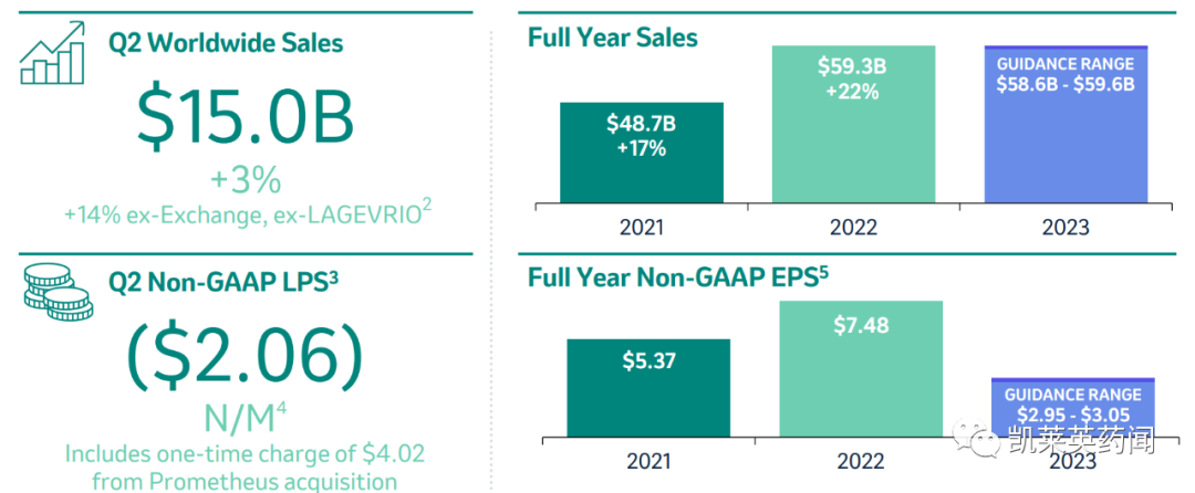 8月1号,默沙东公布财务业绩,2023年Q2营收150 亿美元,较 2022 年第二季度增长 3%;排除LAGEVRIO,增长率为 11%;排除 LAGEVRIO 和外汇影响,增长率为 14%。其中KEYTRUDA 销售额高达,同比增长 19%;排除外汇影响,销售额增长 21%。GARDASIL/GARDASIL 9 销售额25 亿美元,同比增长47%;剔除外汇影响,销售额增长53%。LAGEVRIO销售额2.03亿美元,同比下降83%;剔除汇率影响,销售额下降 82%。