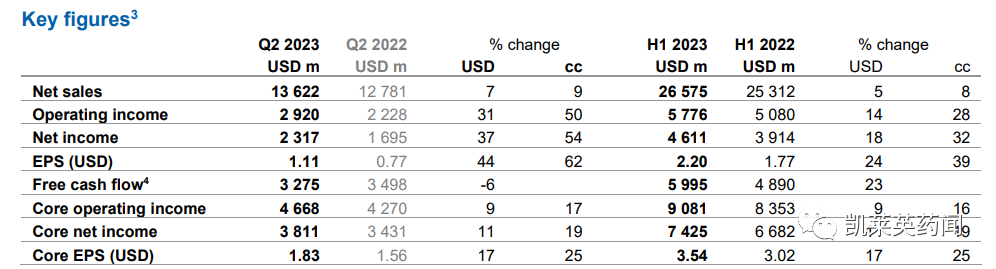 7月18日,诺华公布了2023H1业绩,上半年净销售额为265.75亿美元,同比增长5%,按固定汇率计算增长8%。净利润46.11亿美元,同比上涨32%。其中,创新药收入上半年净销售额为218.13亿美元,同比增长8%,核心增长驱动力来自Entresto、Kesimpta、Pluvicto、Kisqali等。