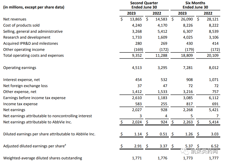 7月27日,艾伯维发布二季度财报,上半年营业收入260.9亿美元,同比下滑7.2%;自免领域上半年收入124亿美元,同比下降7.2%;其中修美乐(Humira,阿达木单抗)上半年收入75.53亿美元,同比下降25.2%;IL-23抗体Skyrizi、JAK抑制剂Rinvoq销量快速增长,增幅超50%。除了免疫板块外,艾伯维的业务还聚焦在神经疾病、血液肿瘤、眼科以及医美领域。其中血液肿瘤业务上半年收入为28.94亿美元,同比下降12.2%,眼科领域收入12.25亿美元,同比下降17.7%,医美业务收入26.84亿美元,同比下降2.2%。神经疾病领域收入为35.80亿美元,同比增长13.8%。