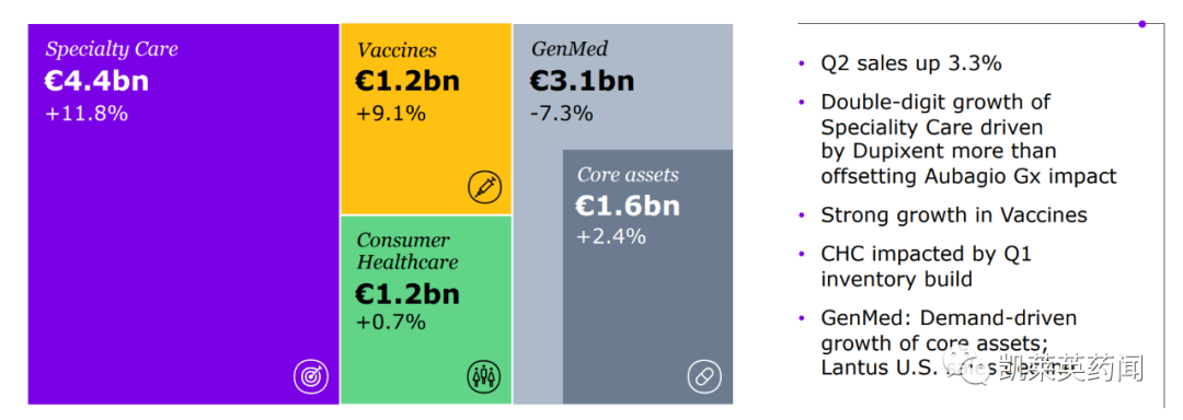 7月28日,赛诺菲公布了2023年Q2财务业绩,净销售额为99.65亿欧元,同比下降1.5%。全球各事业部表现为:专业护理业务销售额为44.03亿欧元;普通药品销售额为31.14亿欧元;疫苗销售额为12.23亿欧元;消费者保健(CHC)业务销售额为12.25亿欧元。