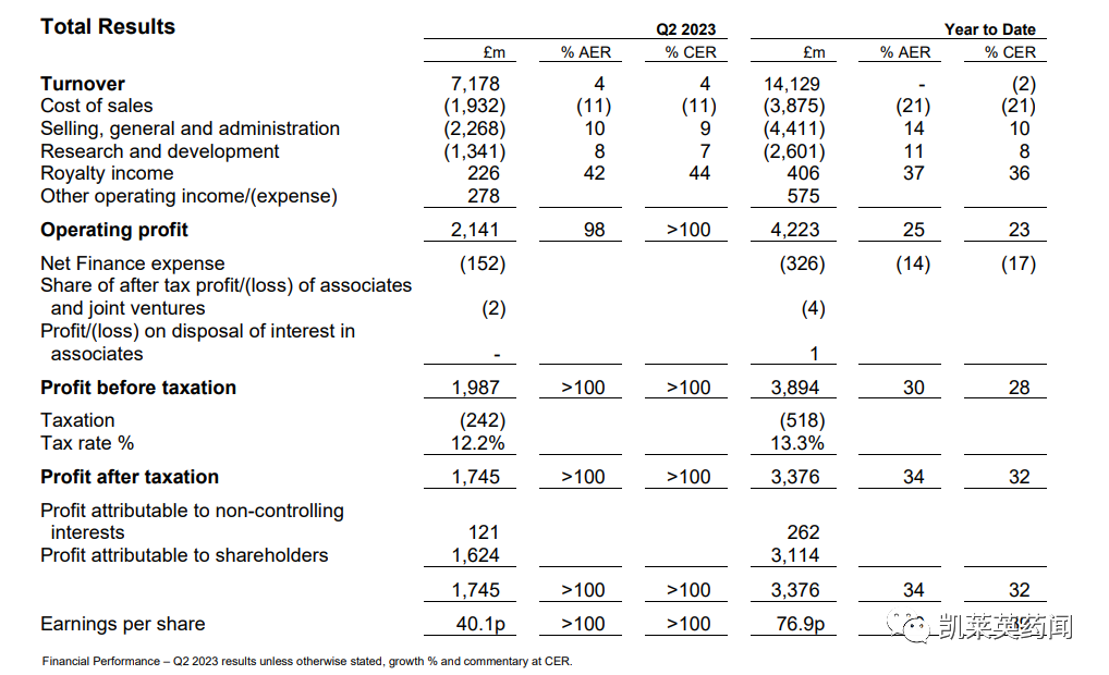 7月26日,葛兰素史克(“GSK”)公布2023年Q2业绩,总营收高达71.78亿英镑,同比增长4%(按固定汇率,下同);其中研发投入13.41亿英镑,同比增长7%;2023年H1总营收高达141.29亿英镑。本季度业绩增长得益于2017年以来推出的产品(包括疫苗和艾滋病毒)销量的强劲增长。公司主营模块包括疫苗(Vaccines)、专药(Specialty Medicines)和普药(General Medicines)。剔除COVID产品(下同),本季度疫苗销量20.22亿英镑,同比增长18%;专药销量25.23亿英镑,同比下降7%;普药销量26.33亿英镑,同比增长8%。