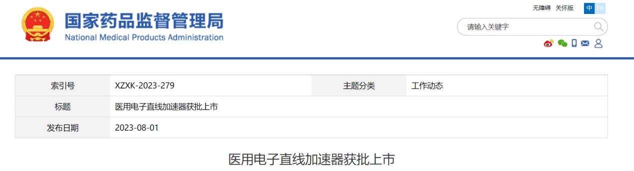 8月1日,国家药监局批准西安大医集团股份有限公司(以下简称“大医集团”)生产的医用电子直线加速器上市,这是一款创新医疗器械。