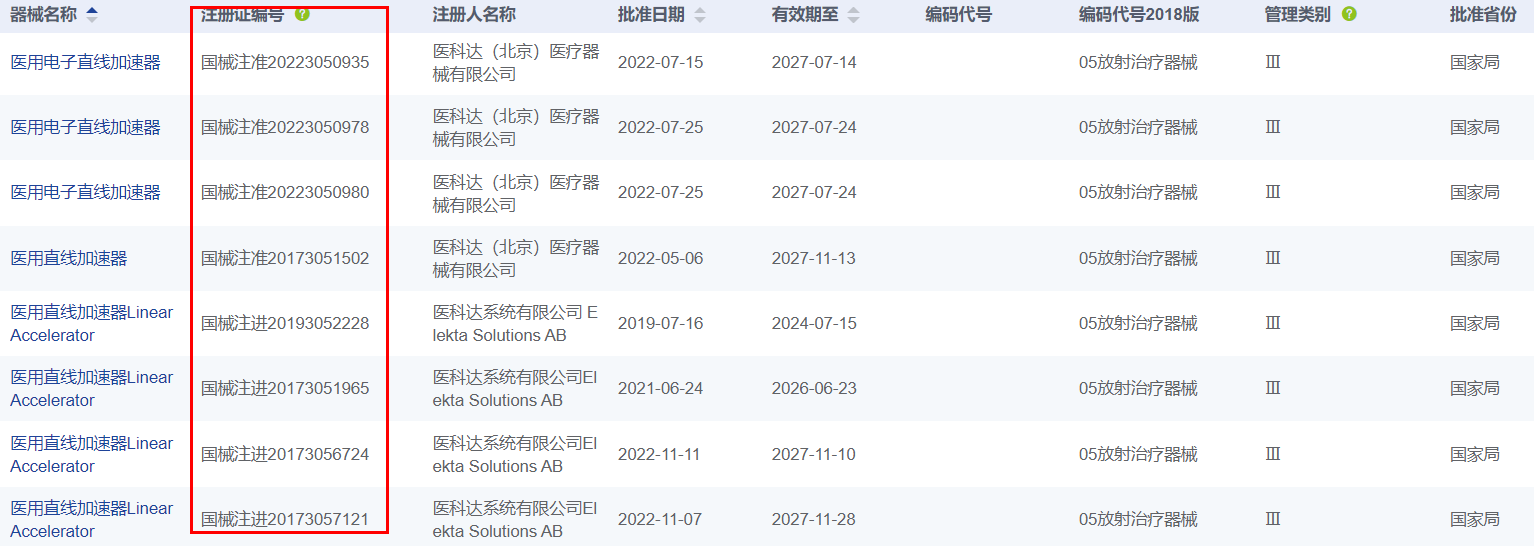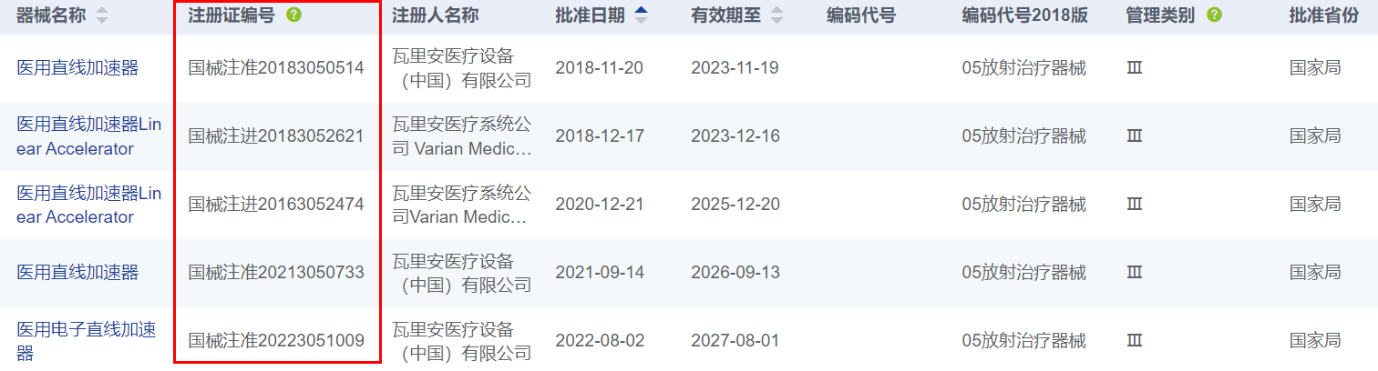 值得一提的是,最初瓦里安及医科达生产的医用电子加速器作为进口产品在我国注册上市,但在中国市场飞速的扩增及政策对医疗器械产业扶持力度加大的趋势下,两家企业实现中国本土化,近年来其产品都成功拿下“国械注准”注册证编号。