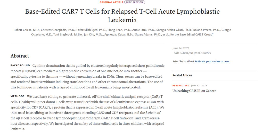 2023年8月3日/医麦客新闻 eMedClub News/--6月14日,来自伦敦大学学院大奥蒙德街儿童健康研究所的Waseem Qasim教授与Robert Chiesa博士和大奥蒙德街儿童医院(GOSH)的骨髓移植/ CAR-T团队合作在《The New England Journal of Medicine》期刊上发表重要研究成果——Base-Edited CAR7 T Cells for Relapsed T-Cell Acute Lymphoblastic Leukemia。这是一项采用碱基编辑(Base Editing,BE)技术开发的CD7 CAR-T细胞疗法,用来治疗复发/难治的儿童急性T细胞白血病(R/R T-ALL)的I期临床试验(ISRCTN15323014)。该研究是碱基编辑技术的首次人类应用,得到了 the Wellcome Trust 和英国国家健康研究所(NIHR)的支持。