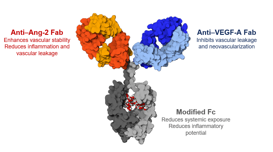Vabysmo是首个被设计用于眼内治疗的双特异性抗体药物,靶向VEGF(血管内皮生长因子)和Ang-2(血管生成素-2)两条通路,用于治疗多种类型视网膜疾病。VEGF和Ang-2 通过破坏血管稳定性、导致渗漏新生血管形成、增加炎症反应,从而造成视力下降。而Faricimab可同时强效、特异性地结合并抑制两个通路的激活,发挥治疗作用。目前Vabysmo海外获批用于治疗老年性黄斑变性(Age-related Macular Ddegeneration, AMD)以及糖尿病性黄斑水肿(Diabetic Macular Edema,DME);此外,为了进一步扩大适应症,目前罗氏制药已向FDA申请新的适应症:视网膜静脉阻塞(Retinal Vein Oocclusion, RVO),预计今年12月22得到答复。