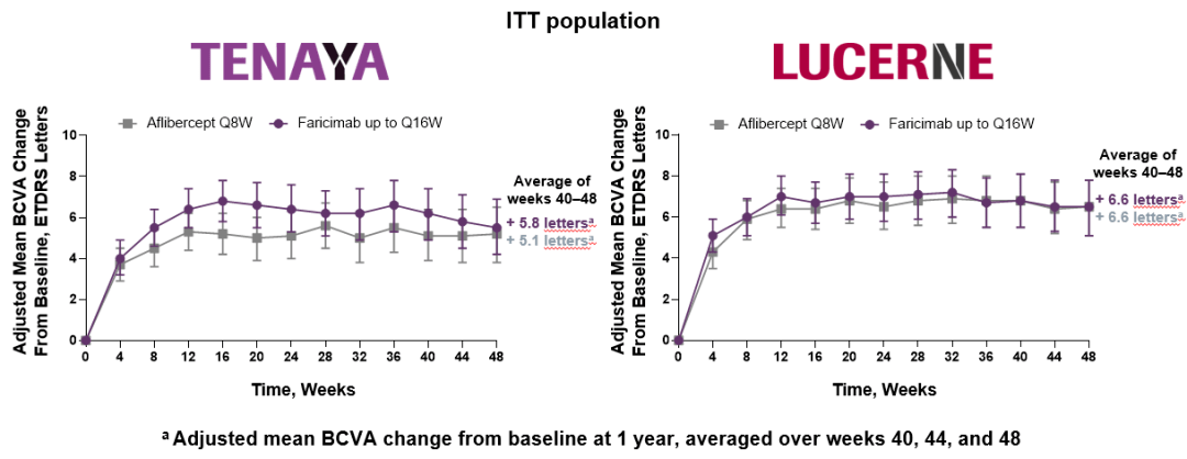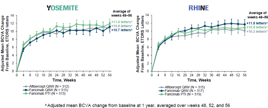 在Vabysmo的4项3期双盲,随机平行对照临床试验TENAYA,LUCERNE,YOSEMITE 以及RHINE中,针对nAMD以及DME患者,每16周Vabysmo (Faricimab,法瑞西单抗)6.0mg玻璃体腔给药1次组的患者视力非劣于每8周艾力雅(Aflibercept,阿柏西普)玻璃体腔给药1次组,且有超过50%的患者,在一年时间内维持了16周一次的给药间隔,同时保持改善视力。此外,在2年随访中,同艾力雅组相比,Vabysmo组的中位注射次数分别减少了33%和21%,减少了患者的治疗次数;在安全性方面,Faricimab总体耐受性良好,同艾力雅发生率相近,未发现新的或非预期不良事件。