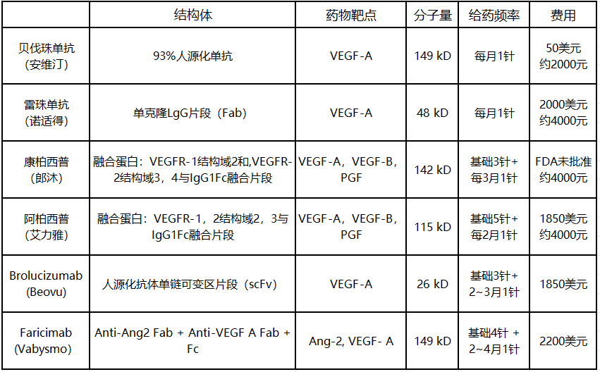 抗VEGF药物为眼底疾病的治疗带来革命性变化,目前已成为许多眼底疾病,包括老年性黄斑变性、糖尿病性黄斑水肿、视网膜静脉阻塞-黄斑水肿等的首要治疗方法。目前已获批上市的药物包括贝伐珠单抗(off-lable)、雷珠单抗、阿柏西普、康柏西普等,详情见下方表格。