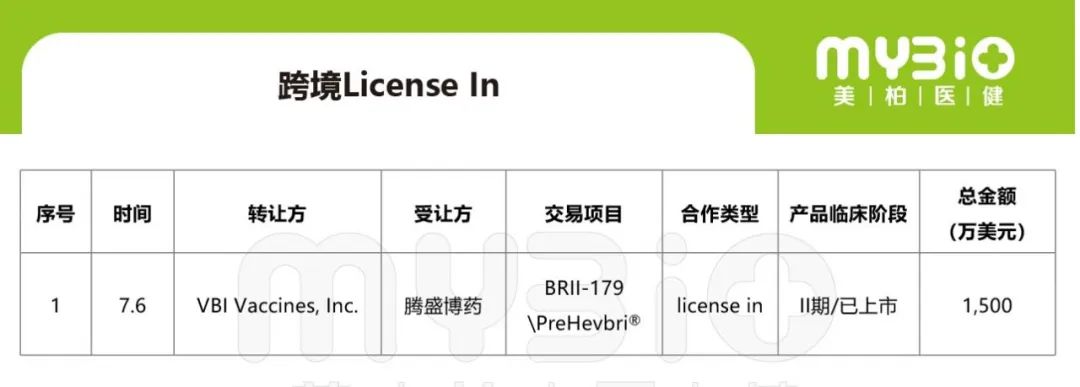 1、腾盛博药宣布与VBI签订许可协议,以拓展双方在乙型肝炎(HBV)领域的战略合作