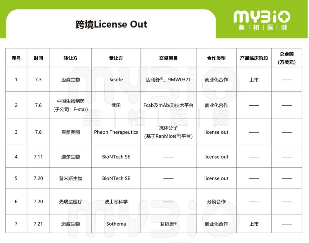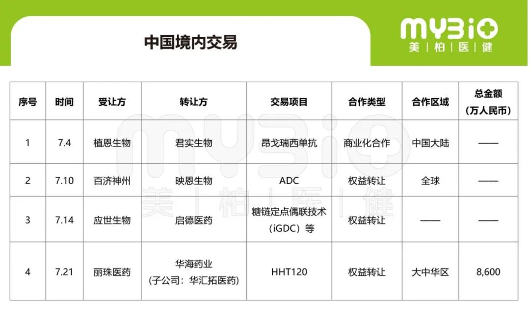 根据美柏资本的统计,7月中国医药BD交易达12笔,分别为1笔跨境资产买入,7笔跨境资产卖出,4笔中国境内交易。