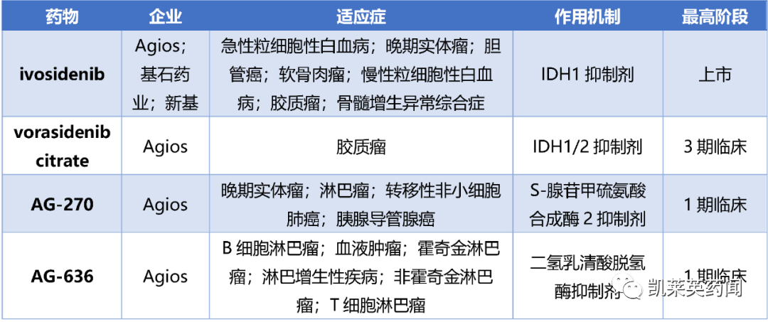Agios的肿瘤管线包括口服白血病药物Tibsovo(ivosidenib),该药已获得FDA批准用于携带易感异柠檬酸脱氢酶1(IDH1)突变的复发或难治性急性髓系白血病(R/R AML)患者和局部晚期(已在附近扩散)或转移性(已扩散到身体其他部位)的胆道癌。Ivosidenib (艾伏尼布)在大中华区和新加坡的开发权益归国内基石药业拥有,2022年2月,该药物获NMPA批准上市,治疗携带易感IDH1突变的成人复发性或难治性急性髓系白血病。