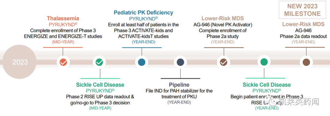 地中海贫血:在不定期输血和定期输血成人地中海贫血患者中,使用Mitapivat治疗的 3 期 ENERGIZE 和 ENERGIZE-T 研究已完成入组,预计于明年公布 3 期研究结果。