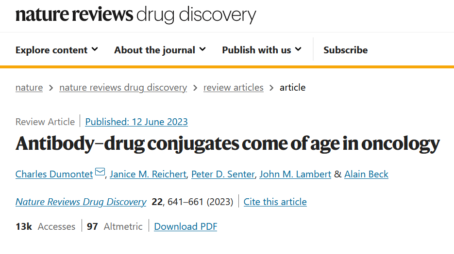 1. Dumontet C, Reichert JM, Senter PD, Lambert JM, Beck A. Antibody-drug conjugates come of age in oncology. Nat Rev Drug Discov. 2023 Jun 12. doi: 10.1038/s41573-023-00709-2. Epub ahead of print. PMID: 37308581.