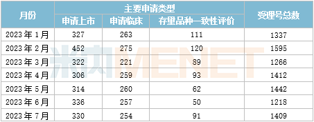 2023年1-7月CDE承办药品注册申请情况(按受理号计)