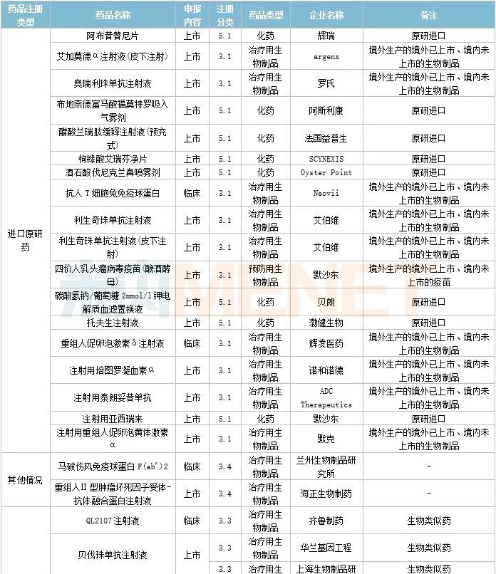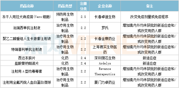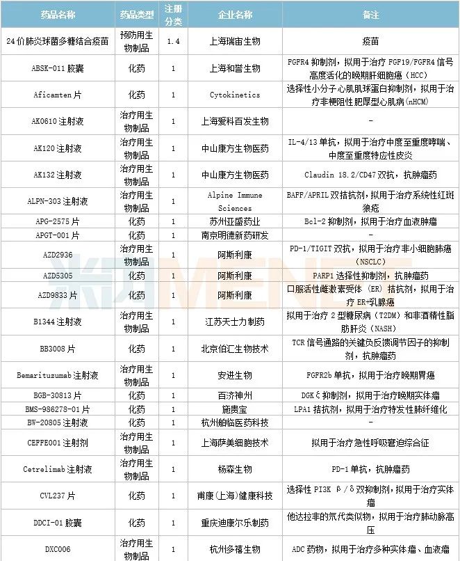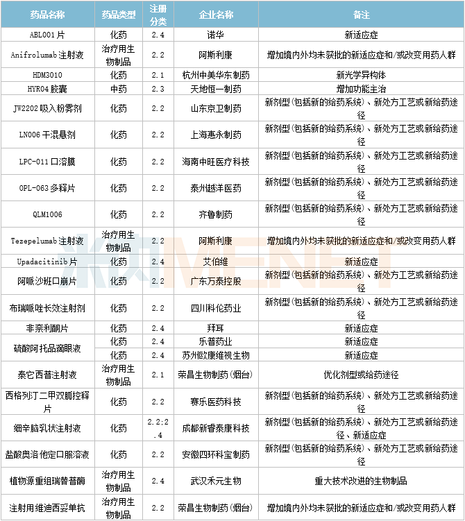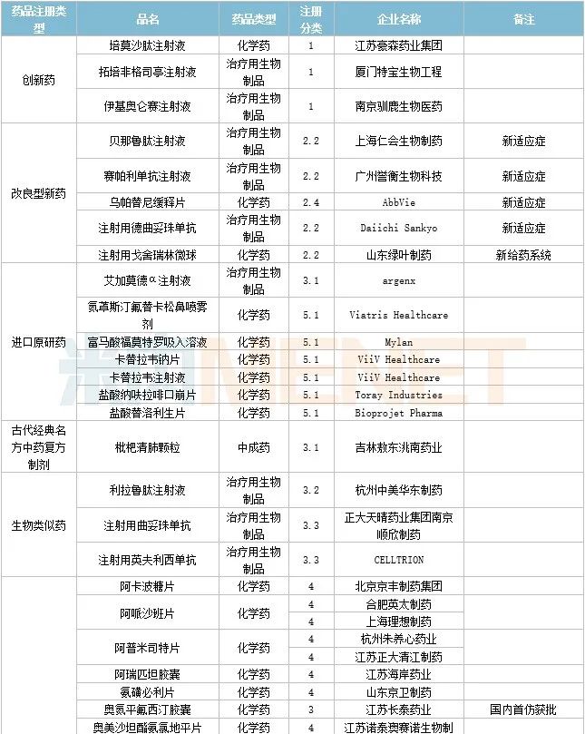 5个改良型新药获批,其中山东绿叶制药的注射用戈舍瑞林微球为新给药系统,贝那鲁肽注射液(上海仁会生物制药)、赛帕利单抗注射液(广州誉衡生物科技)、乌帕替尼缓释片(AbbVie)、注射用德曲妥珠单抗(第一三共)等均获批新适应症。