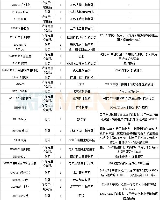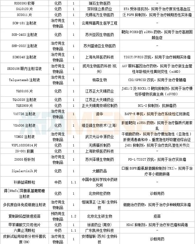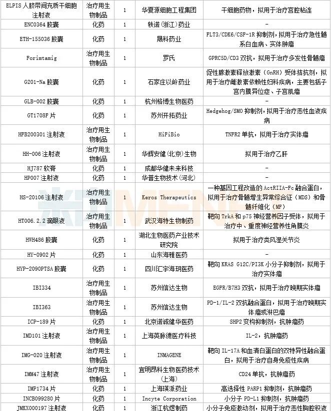 数据来源:米内网中国申报进度数据库(MED)、CDE、NMPA;相关统计字段按药品名称统计,时间截至2023年7月31日;获批品种按NMPA发布时间统计;药物作用靶点以及适应症整理自公开资料。