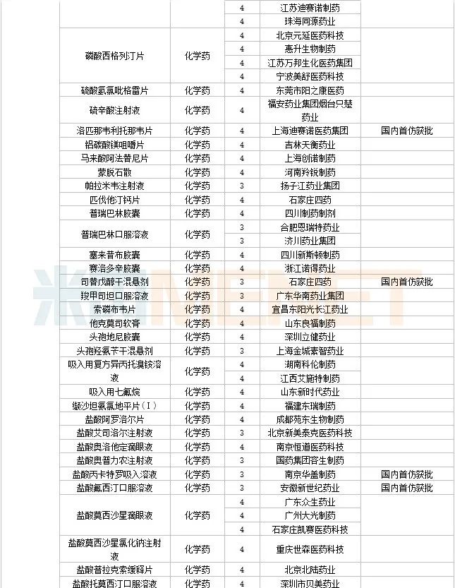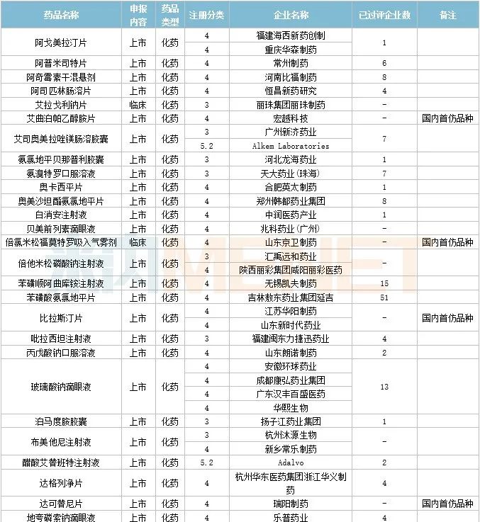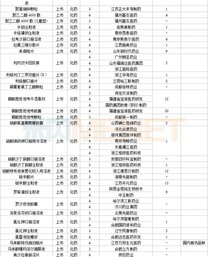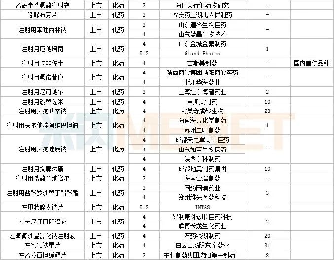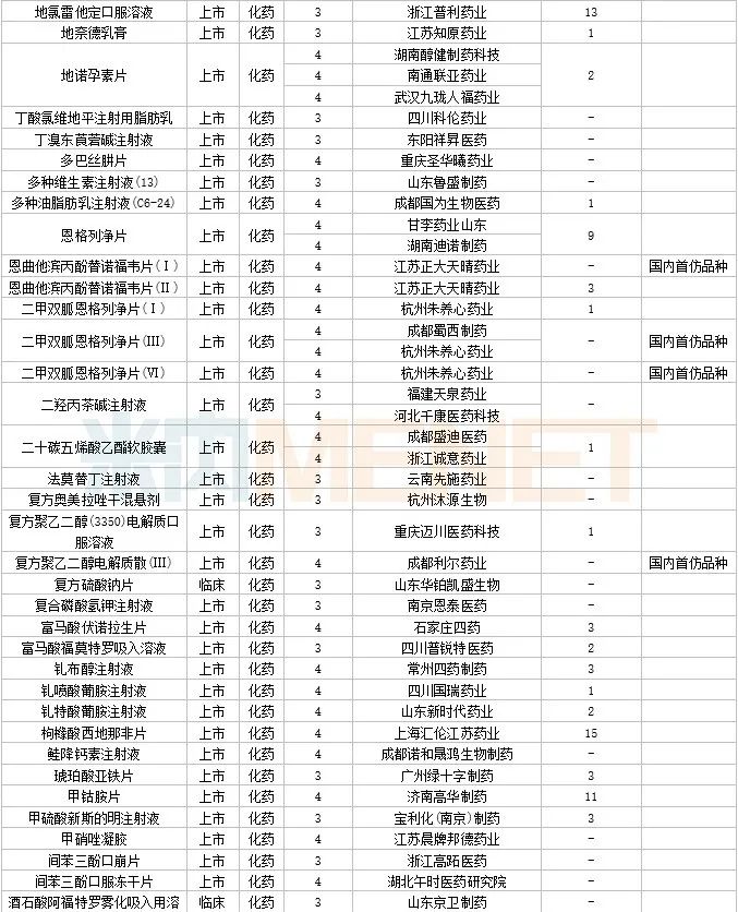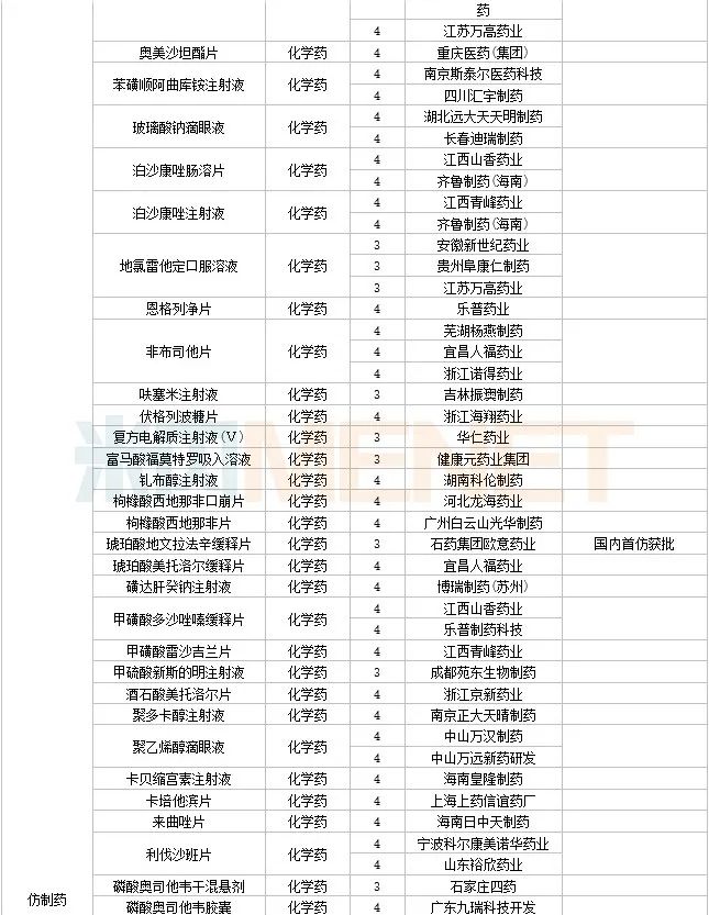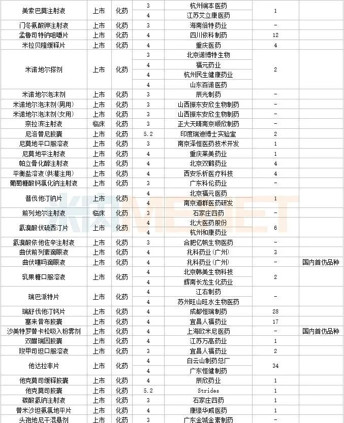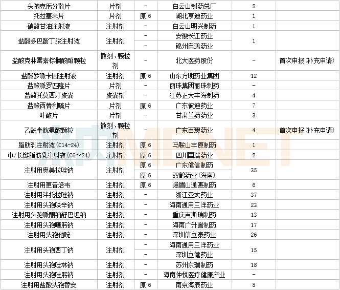 82个仿制药获批,奥氮平氟西汀胶囊(江苏长泰药业)、琥珀酸地文拉法辛缓释片(石药集团欧意药业)、洛匹那韦利托那韦片(上海迪赛诺医药集团)、司替戊醇干混悬剂(石家庄四药)、盐酸丙卡特罗吸入溶液(南京华盖制药)、盐酸氟西汀口服溶液(安徽新世纪药业)、注射用头孢哌酮钠舒巴坦钠/氯化钠注射液(北京锐业制药)、注射用头孢西丁钠/氯化钠注射液(北京锐业制药)等8个品种为国内首仿品种。