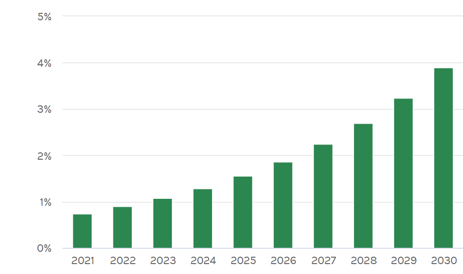 图1. AI研发成本在制药业总成本投入的比例关系图。 图片数据来源:Morgan Stanley