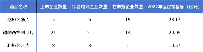 随着国家集采的持续推进,降糖药领域已基本实现应采尽采。按销量计,2022年医院市场中,纳入国采的降糖药品种占85%的市场,中标的品牌占66%的市场。据药智咨询统计分析,目前降糖药综合过评(原研+过评)企业数量≥5家且未纳入国采仅6个品种,其中达格列净片、磷酸西格列汀片和利格列汀片2022年销售额均大于10亿元,极大可能被纳入第九批国家集采。达格列净片目前仅5家企业获批,但申报企业高达19家;而磷酸西格列汀片已有21家企业过评,仿制竞争非常激烈。相比而言,利格列汀片拥有超10亿的市场规模,竞争格局较达格列净和西格列汀也较好,建议仿制药企可以加以关注。