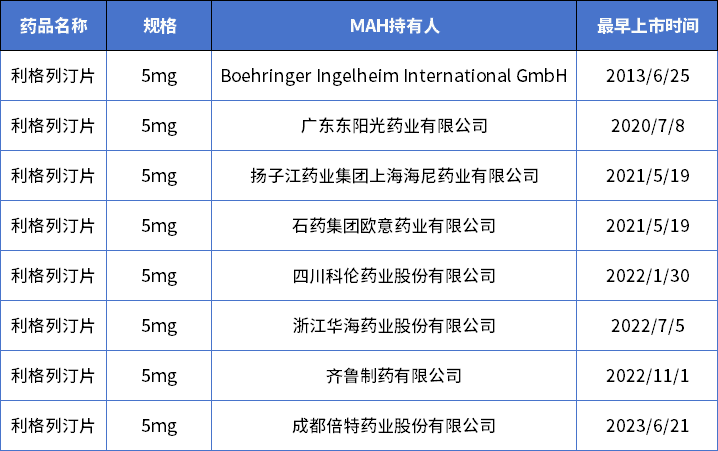 利格列汀是一种二肽基肽酶-4(DPP-4)抑制剂,原研产品(Trajenta/Linagliptin)于2011年5月获美国FDA批准上市,原研单位是勃林格殷格翰公司;2013年3月,中国药监局批准了利格列汀的进口注册,用于改善成人2型糖尿病患者血糖。利格列汀的化合物专利于2023年8月到期,目前国内是1家原研+7家仿制的竞争格局,另有1家仿制在申报上市。