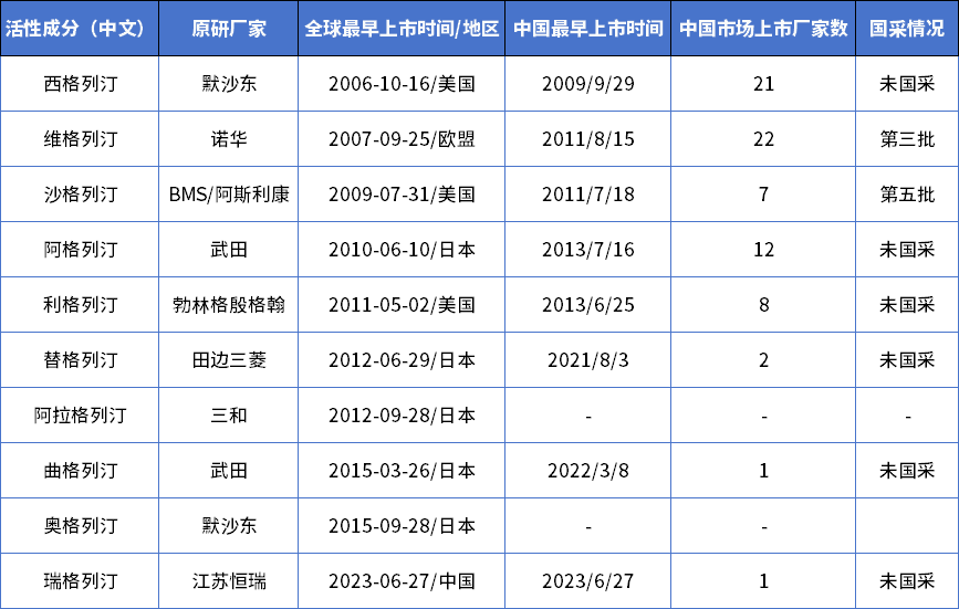 DPP-4i是一类葡萄糖依赖性促进胰岛素分泌、抑制胰高血糖素分泌的口服降糖药物,单用不发生低血糖风险,也是最早通过心血管结局研究验证心血管安全性的降糖药。按活性成分计,DPP-4i类降糖药全球共上市10个活性成分,中国上市8个,分别为:西格列汀、维格列汀、沙格列汀、阿格列汀、利格列汀、替格列汀、曲格列汀和瑞格列汀。