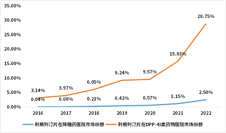 图3 2016-2022年利格列汀片在降糖药和DPP-4i类药物医院市场销售额市场份额 数据来源:药智咨询《糖尿病治疗药物市场分析》报告