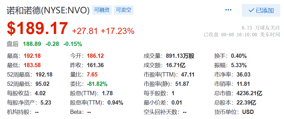很难想象,数千亿美元市值的股价,动辄便是两位数的飙升。上一次见到,还是马斯克“血洗”华尔街各大空头大佬。一夜之间,两家内分泌领域的巨头,股价原地飞升,诺和诺德大涨17%,礼来涨近15%。