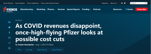 具体而言,3款罕见心肌病药物Vyndaqel、Vyndamax、Vynmac表现颇为亮眼,2023年上半年累计销售额达14.68亿美元,同比增长29%,成为辉瑞业务颇为强劲的增长引擎。此外,不难发现,新冠口服药Paxlovid已不在辉瑞畅销药物名单之列。随着新冠药物红利消退,辉瑞P药全球销售下滑九成,辉瑞计划大幅削减成本。