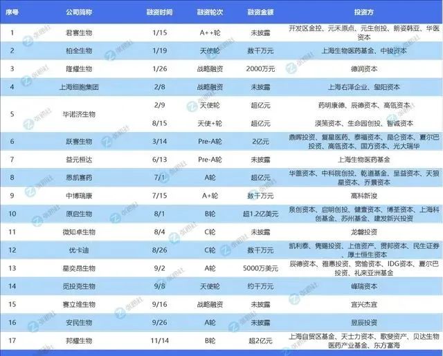 除了上述两家企业外,在干细胞和免疫细胞方面都有产品处于研发或临床阶段的邦耀生物获得了上海自贸区基金、天士力资本等的超2亿元B轮融资;专注基于iPSC衍生的CAR-NK技术开发通用型量产化免疫细胞产品的星奕昂生物科技获得了5000万美元的A轮融资,投资方包括辰德资本、雅惠投资、IDG资本等等。