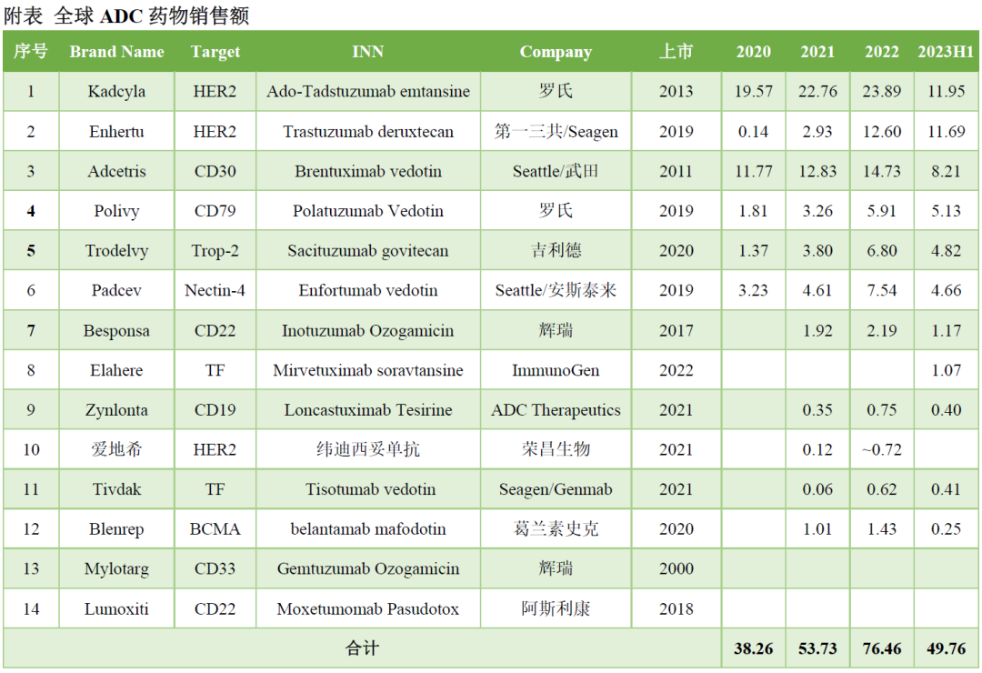 从具体ADC新药来看,除葛兰素史克BCMA ADC因为验证性临床失败销售萎缩,其他ADC多表现出高速增长的趋势。DS-8201今年销售额有望超过25亿美元,CD79b ADC、Trop2 ADC、Nectin-4 ADC今年大概率都将超过10亿美元。ImmunoGen的FRα ADC上市后放量迅速,超出预期,上半年销售额1.07亿美元,预计首年即将突破5亿美元。