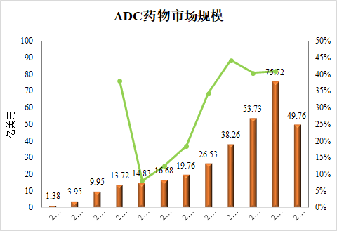 ADC药物市场规模继续保持高速增长趋势,今年将首次突破百亿美元规模,增长率将过40%。